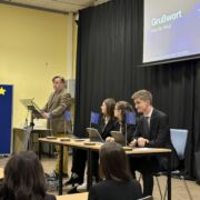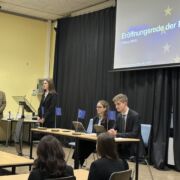Zum Anlass des diesjährigen schulinternen Planspiels Modell- Europa- Parlament erarbeiteten die Schülerinnen und Schüler der Klassen 10 a-c in den Ausschüssen ITRE, LIBE, INTA und EMPL vier Resolutionen zu den hochaktuellen Themen Energiewende, Rechtspopulismus, internationaler Handel und Inklusion benachteiligter Jugendlicher in der EU. Dieser erste Tag startete mit warmen Worten unserer Präsidentin Tiffany Wirth (12. Klasse).